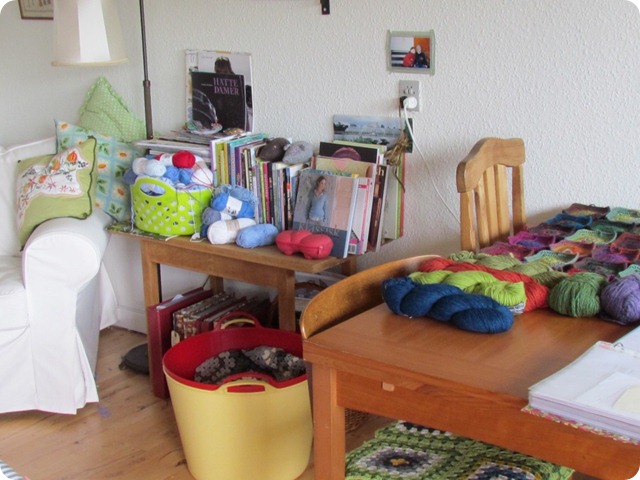 Min stue kom jeg fra. Min stue som stadigt mangler lidt finish hist og her, blandt andet i form af billeder, tegninger og andet sjovt, der ganske som Pernille også kunne fortælle om forleden, har indkøbte rammer stående parat i en bunke. Min glædesbold i maven er der fordi jeg i min stue kan være den jeg er, uden at skulle fjerne sporene hele tiden. Har jeg behov for kreativt rod, eller omvendt pertentlig ordentlighed er det ikke noget problem. Lige nu er det det kreative rod, der hersker herinde. Her er spor efter en sommer med mange forskellige ideer, som er hevet frem og lagt til side igen. Her er strik og hækling i een stor pærevælling og opskrifter alle vegne, for slet ikke at tale om garnet som er endt udenfor reolen. Garnreolerne ja de er ikke længere så fint organiserede som de var i vinter, men det bedste af det hele er..