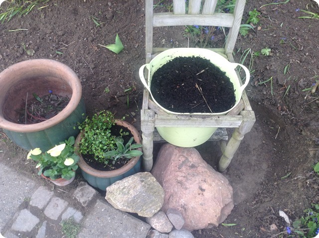 Det er det bare ikke for mig. Frodighed og farverigt skal her være, og det sidste jeg tog fat på i går var et underligt hjørne lige ved postkassen. Der lå en kedelig bunke grus/jord som bare var efterladt, her var gravet ud til en brønd og her var masser af dumpede fliser og affald. Det er der så ikke mere…